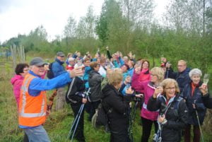 Voor de veiligheid begeleid door een professionele verkeersregelaar fietste de grote groep via Molenschot en het Chaamse Bos naar wijngaard Dassemus in Chaam. Hier werden ze ontvangen door wijngaardhouder Ron Langeveld. Na koffie en thee volgde een schitterende Nordic Walkingwandeling door de prachtige, maar zompige landerijen rond de Chaamse Beek. De aanwezige natuur liet zich door alle vocht van de mooiste kant zien.