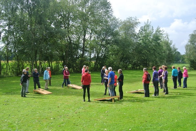 wijngaard Dassemus naar De Steengroeve in Chaam. Hier wachtte hun de volgende verrassing. De groep werd gesplitst en beide groepen gingen achtereenvolgens bosgolven en het spel Corn hole spelen. Beide spelen waren voor bijna alle deelnemers een nieuwe ervaring. Met veel enthousiasme en fanatisme gingen de diverse teams aan de slag. Het leidde tot veel hilarische momenten en bij allen vooral veel plezier.