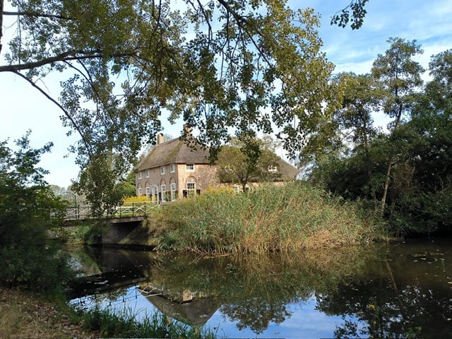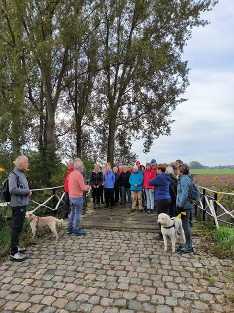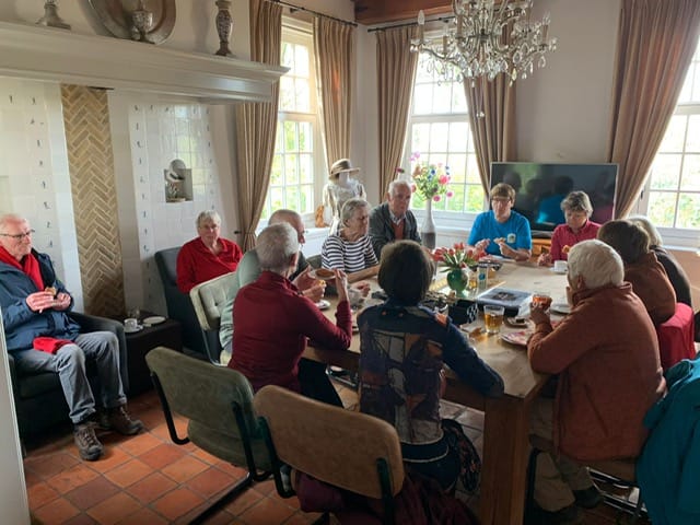 Het werd een fantastische tocht langs de Donge. Verderop richting Waspik wachtte een bijzondere verrassing. Bij theetuin De Lage Brug werd de ophaalbrug neergelaten voor de grote groep. De eigenaar van de fraaie hoeve ontving de NWGR’ers met veel enthousiasme. Naast koffie en appelflap in de monumentale hoeve trakteerde hij ons op een beeldend verhaal over de historie van het landschap met de waterlopen en de hoeve.